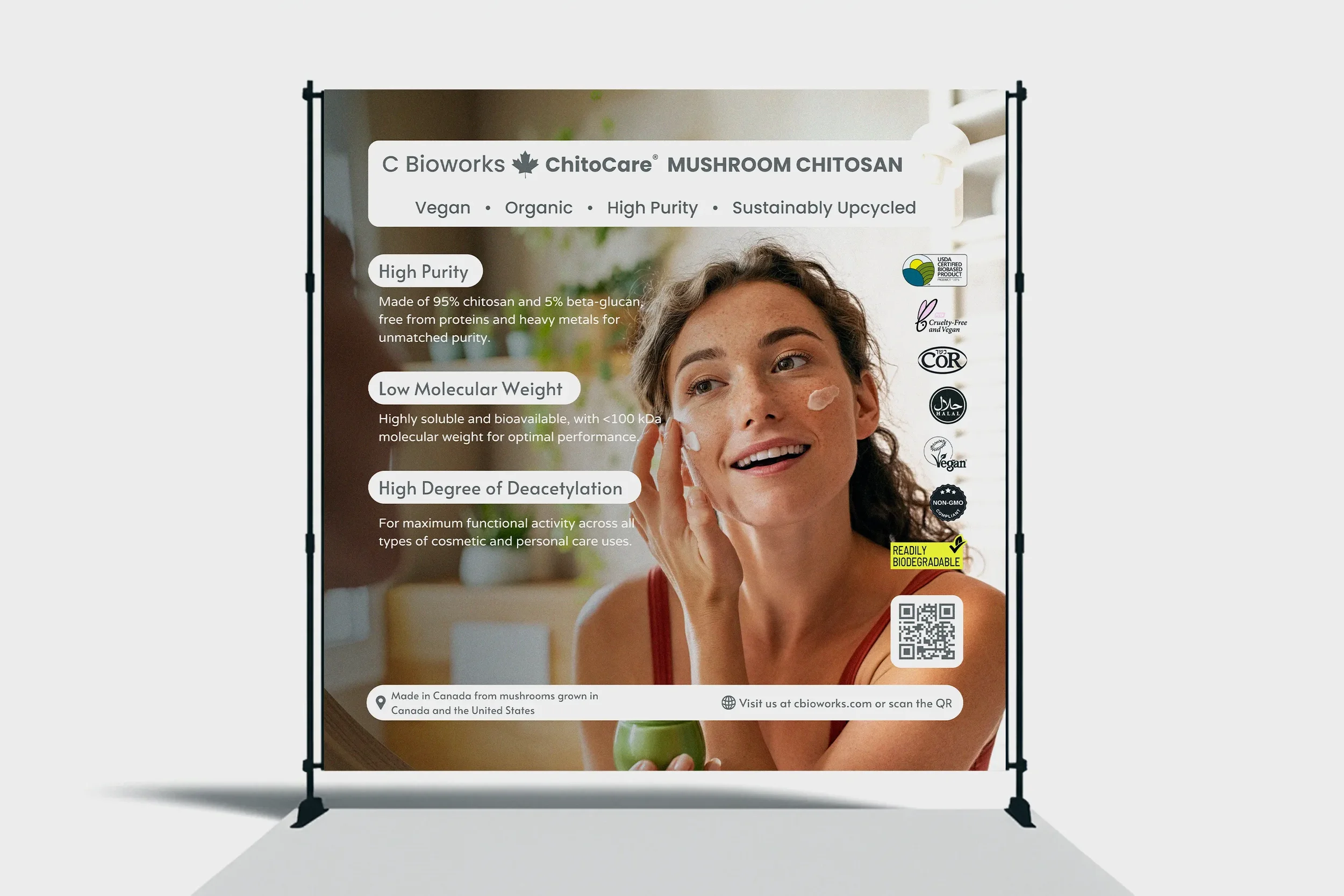 I led the creative across an eight-week timeline, from brief to final deliverable, designing packaging, a product postcard, a backdrop banner, and a website as a cohesive brand system bridging biotech rigour with clean beauty aesthetics. A consistent radial composition, pill-shaped callout labels, and a warm earthy palette scaled from a 25g sachet to a trade show backdrop.