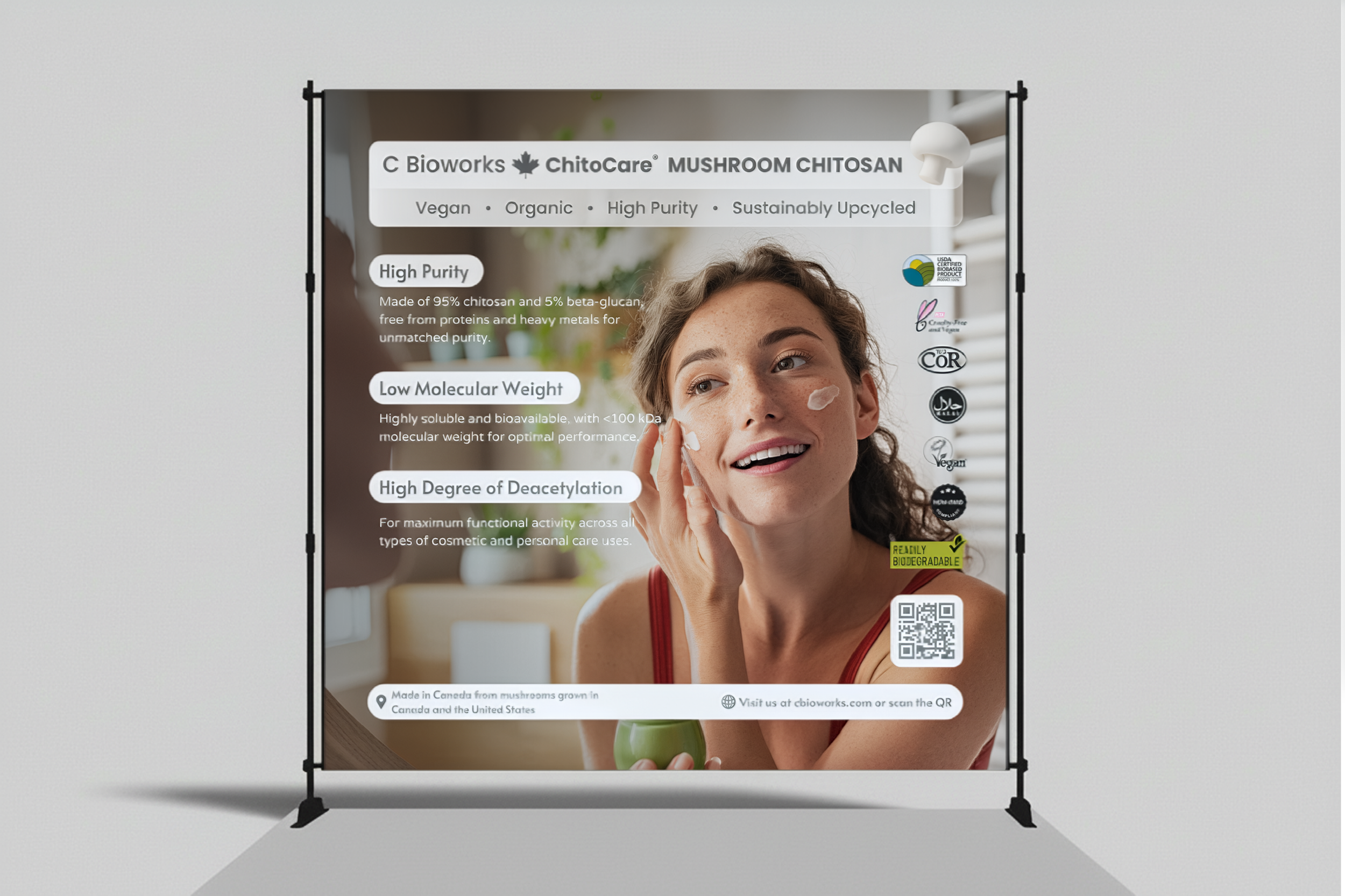 This 8x8 ft. backdrop banner was strategically designed to serve as the visual centrepiece of the booth, capturing attention from a distance and communicating core product value propositions even to passersby. The layout and content were thoughtfully aligned with the booth’s overall furniture and traffic flow to maximize visibility, ensuring that ChitoCare®'s key benefits—purity, performance, and sustainability—were conveyed through compelling graphics and concise messaging.