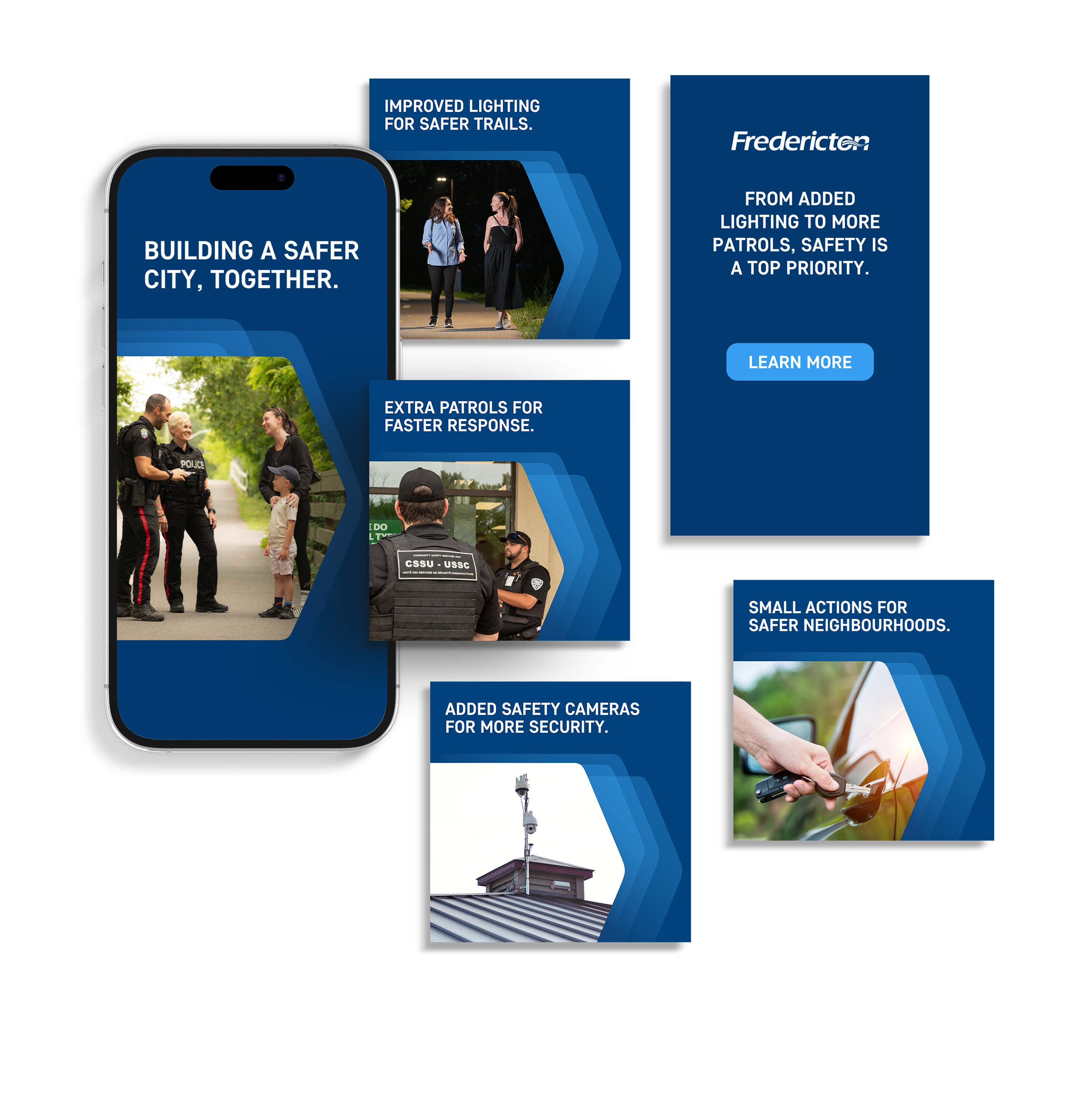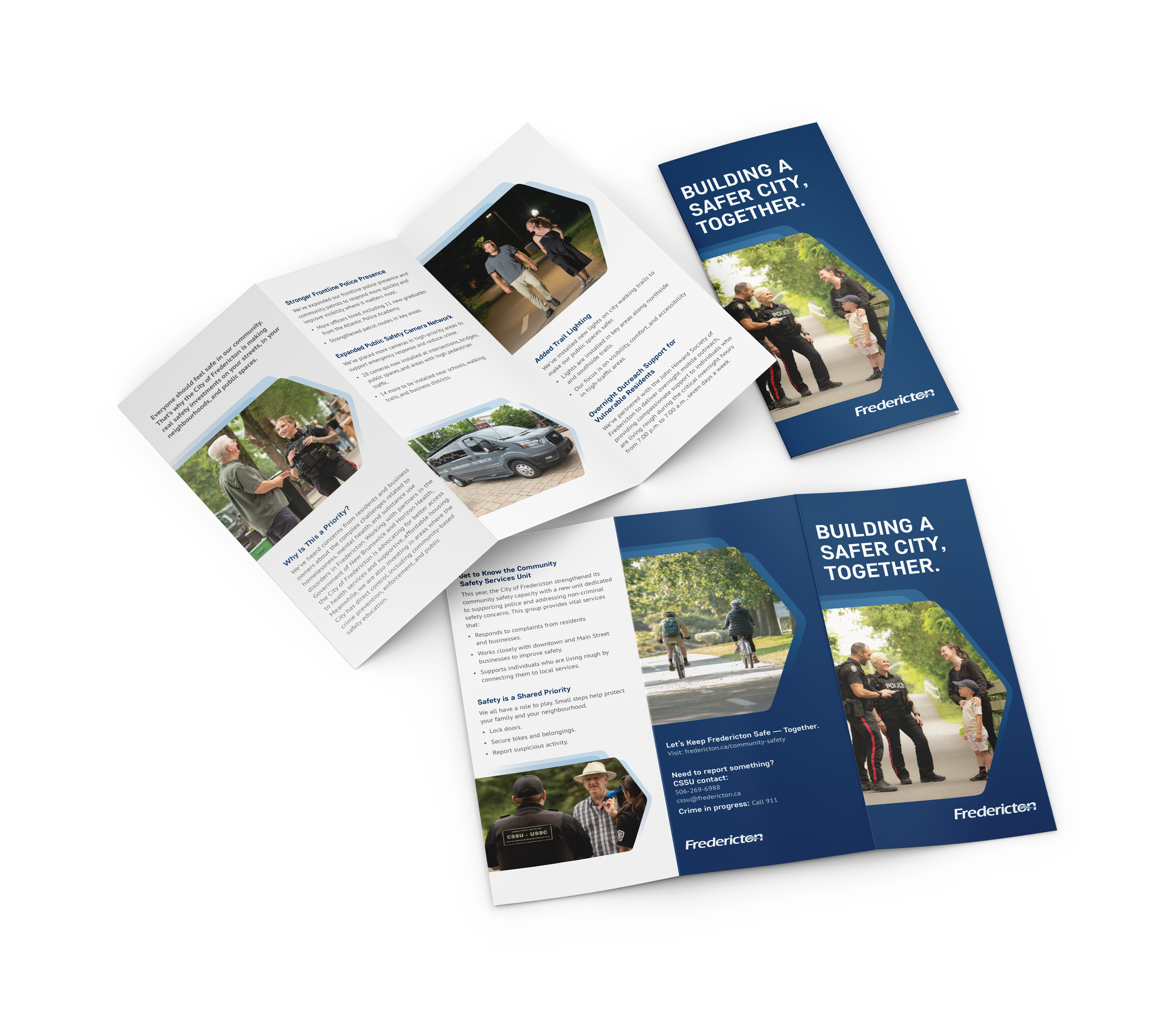 The City of Fredericton required a comprehensive campaign to transparently communicate its safety investments to citizens, workers, and homeowners, specifically focusing on the downtown area. The design directive sought a balance of authority and accessibility—aiming for an aesthetic that was "strong but not in your face" and "rigid but not dominant." Spanning print and digital platforms, the project utilized layered information levels to foster public trust, addressing tangible community concerns such as trail lighting infrastructure and bike theft prevention.