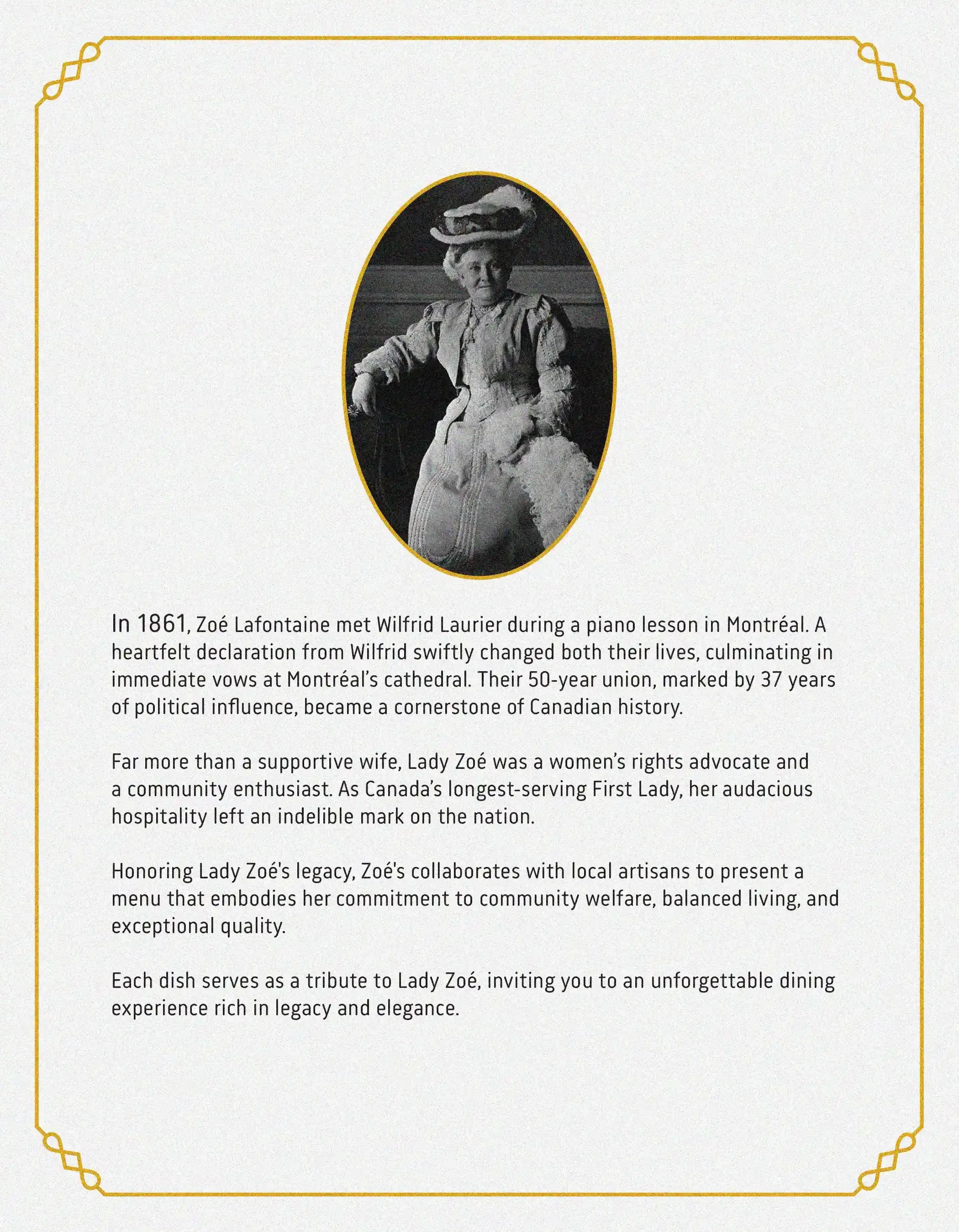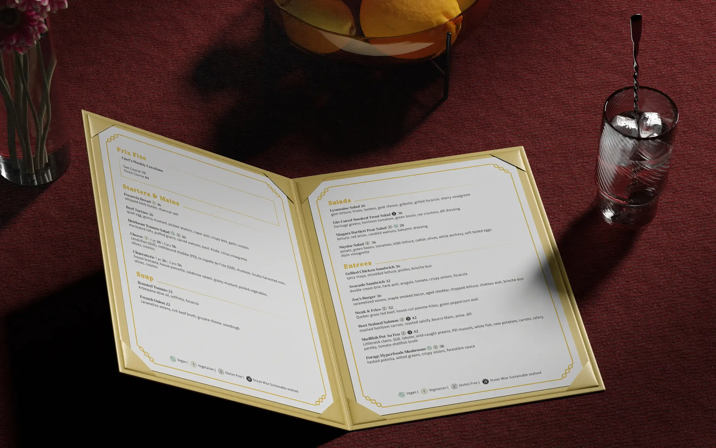 Zoé's is the signature restaurant inside the Fairmont Château Laurier in Ottawa, one of Canada's most iconic heritage hotels. The menu needed to feel worthy of the room. I worked directly with the executive chef and marketing director to understand what the new interior aesthetic called for and built the redesign around that conversation.
