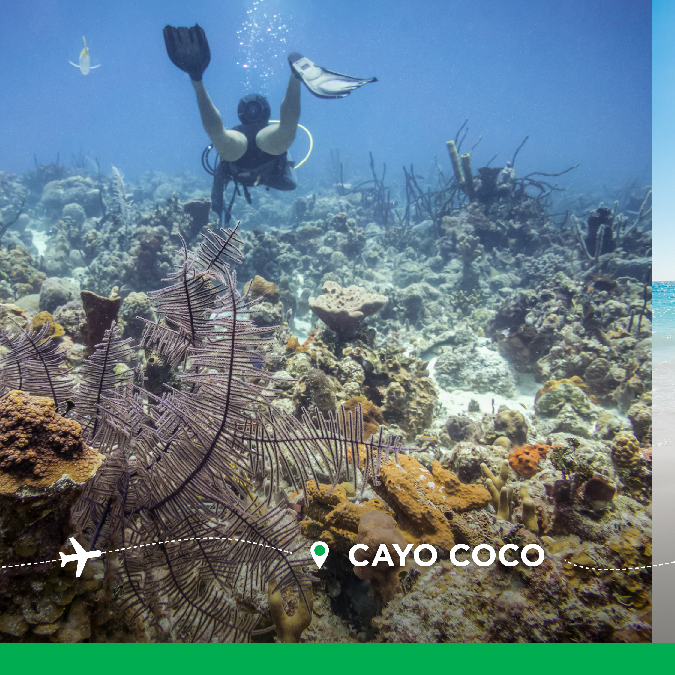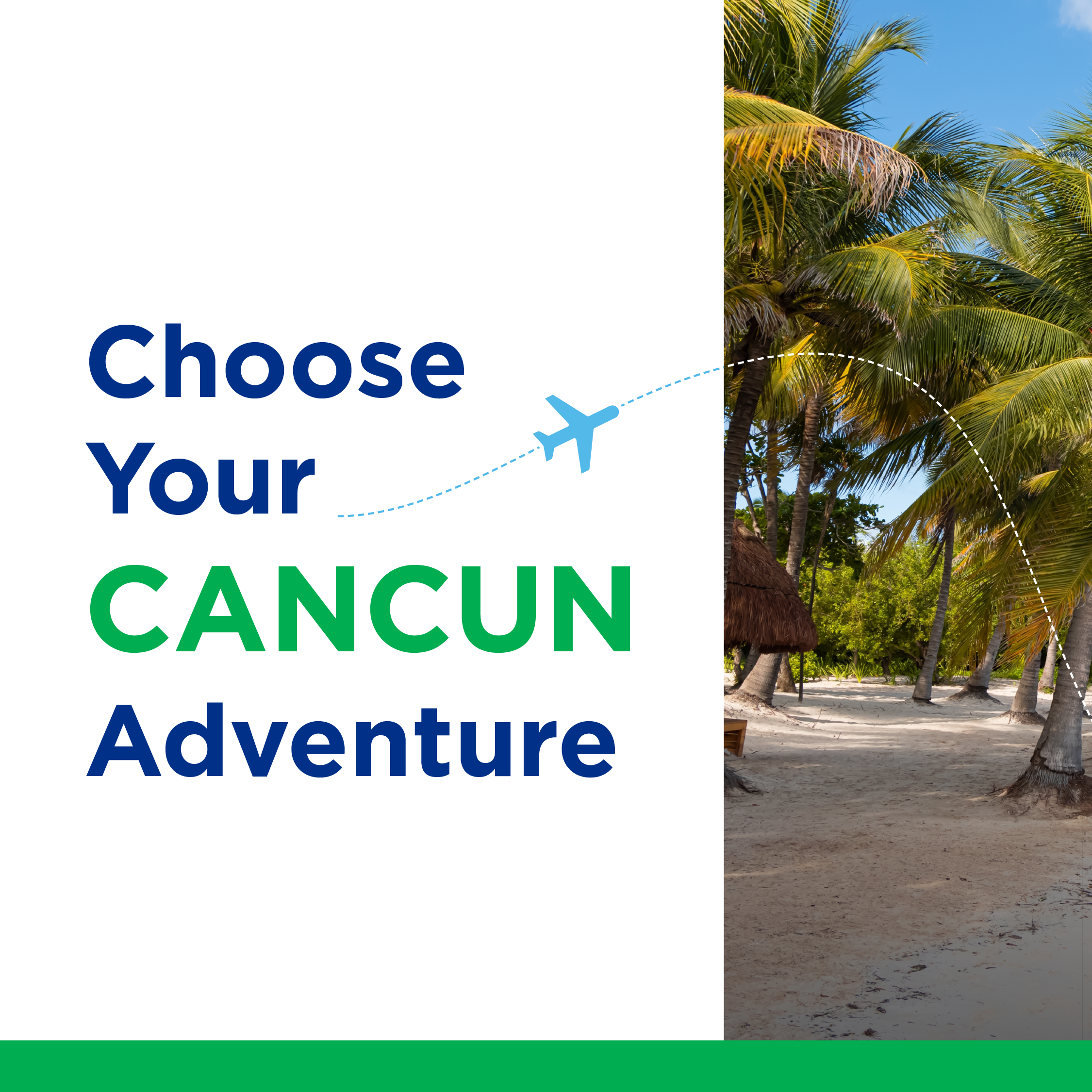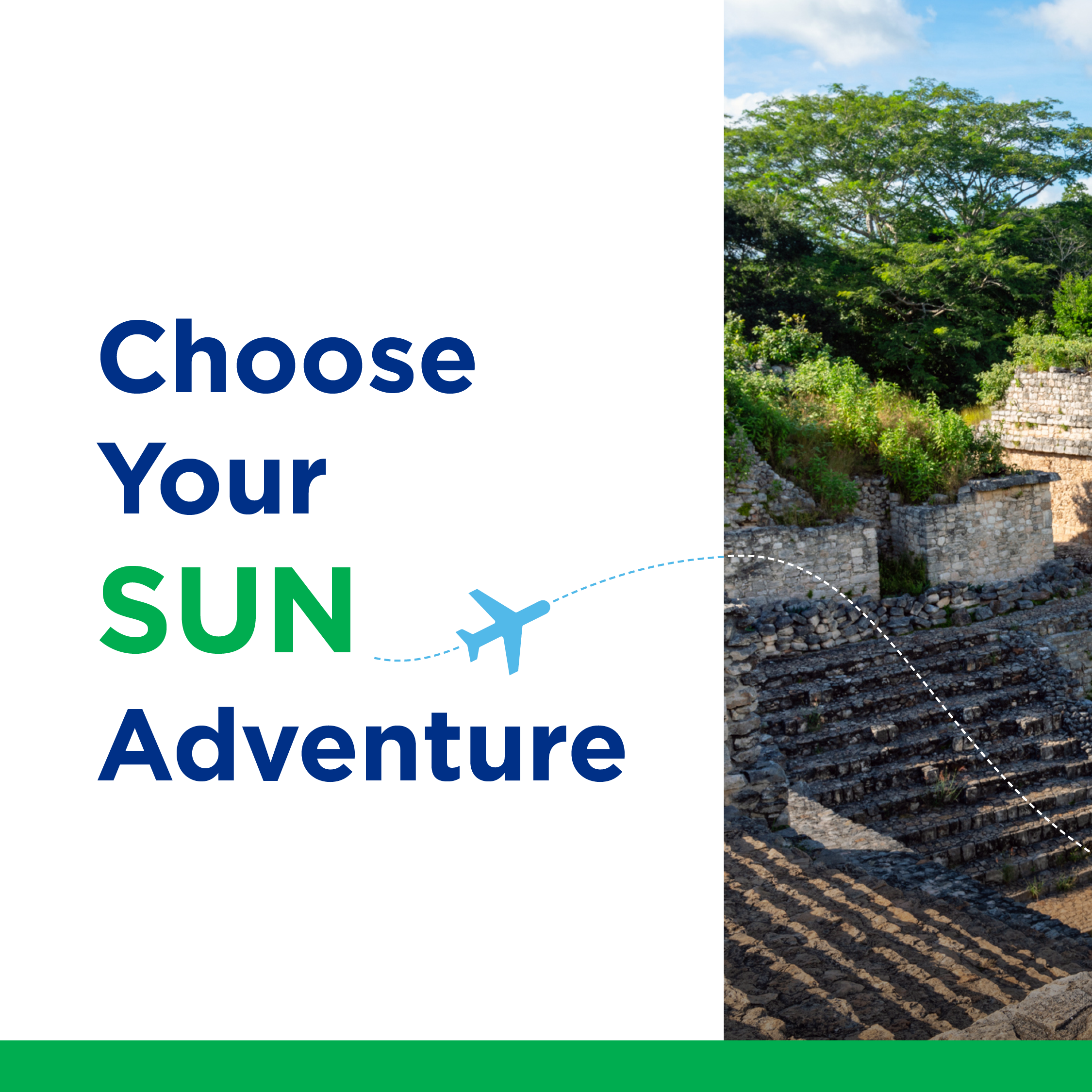 This 15-second Sunwing ad promotes direct flights from Fredericton to Cancun, Cayo Santa Maria, Cayo Coco, and Punta Cana across Google and YouTube. It pairs fast-paced visuals of snorkeling, Mayan ruins, and beach parasailing with text overlays to highlight local departure convenience and drive bookings. For versatile digital placement, the video is optimized in 16:9, 1:1, and 9:16 aspect ratios.