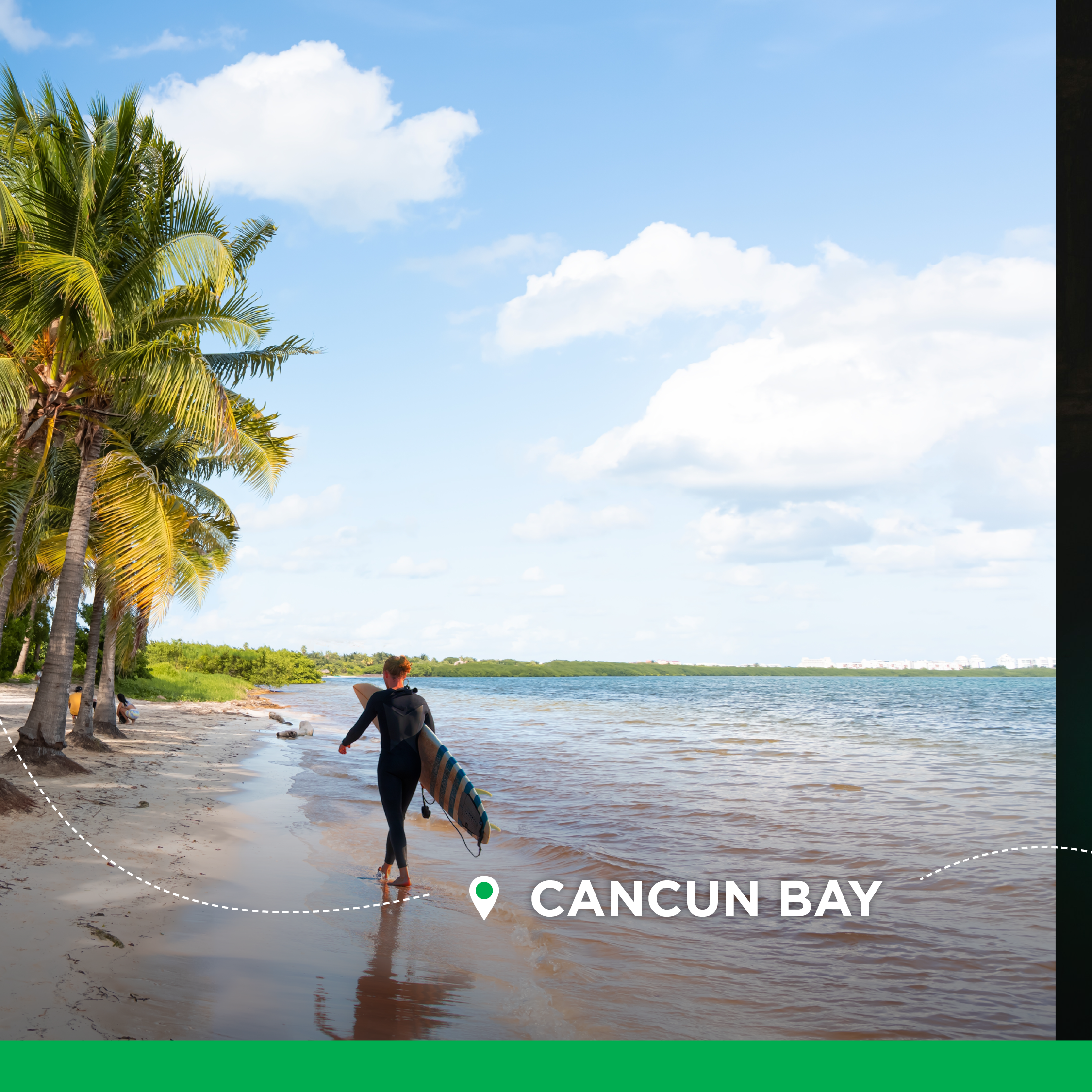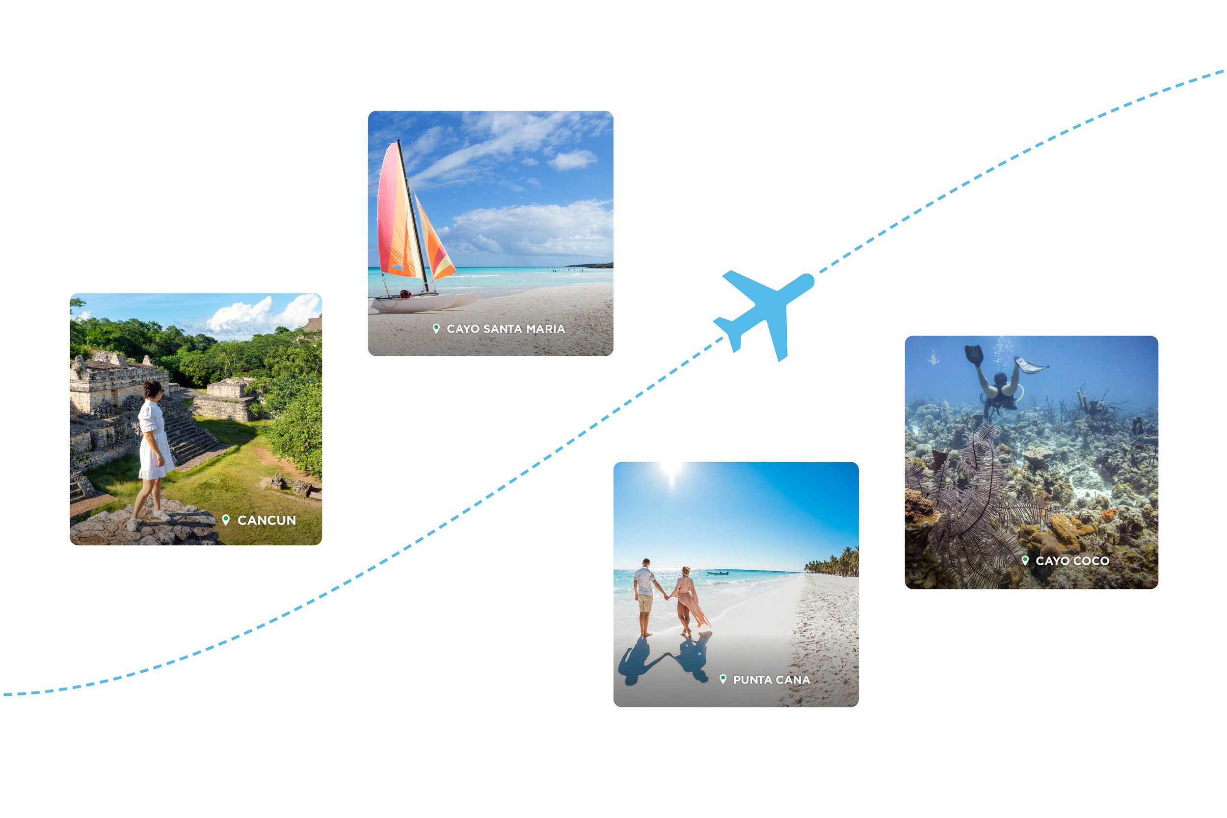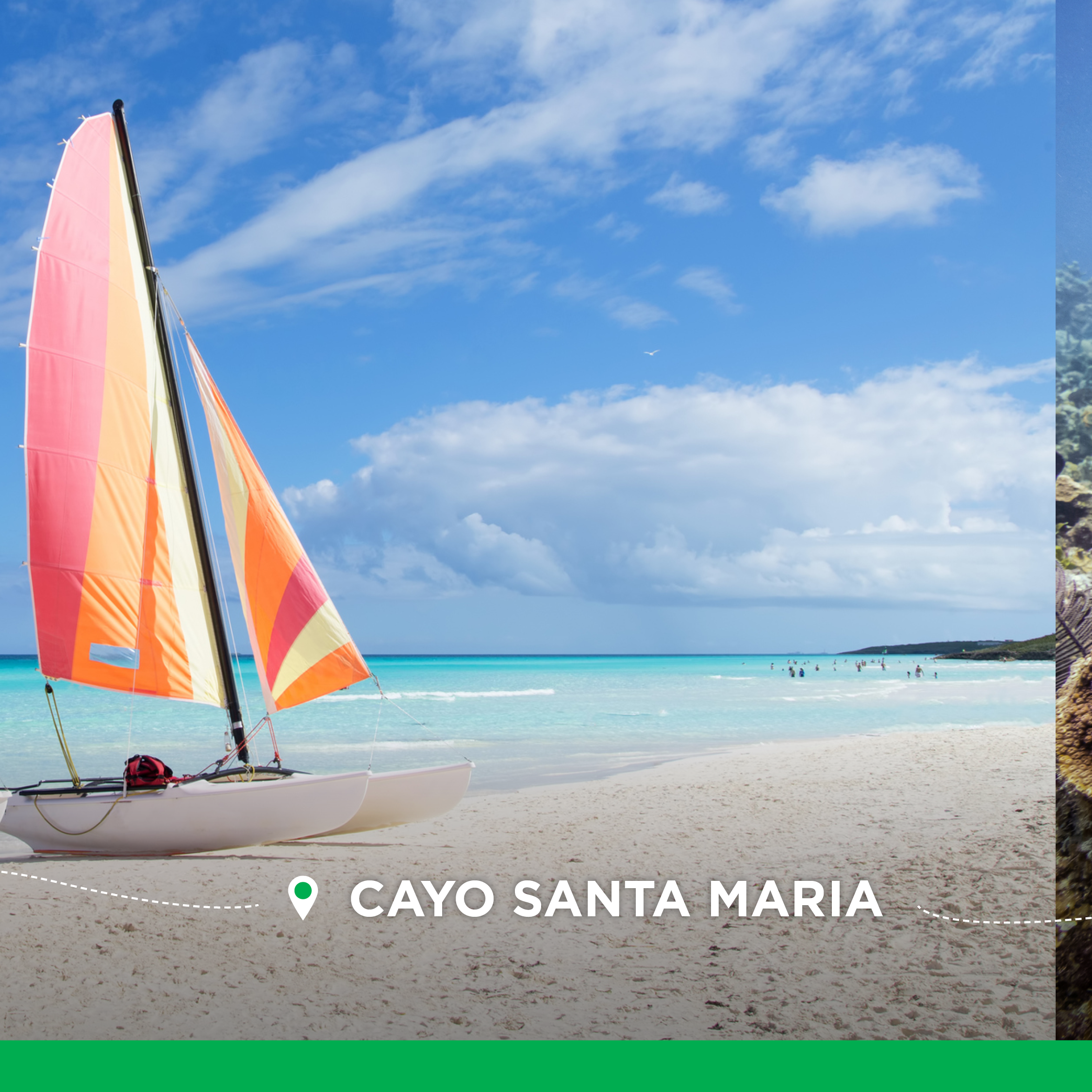 This 15-second Sunwing ad promotes direct flights from Fredericton to Cancun, Cayo Santa Maria, Cayo Coco, and Punta Cana across Google and YouTube. It pairs fast-paced visuals of snorkeling, Mayan ruins, and beach parasailing with text overlays to highlight local departure convenience and drive bookings. For versatile digital placement, the video is optimized in 16:9, 1:1, and 9:16 aspect ratios.